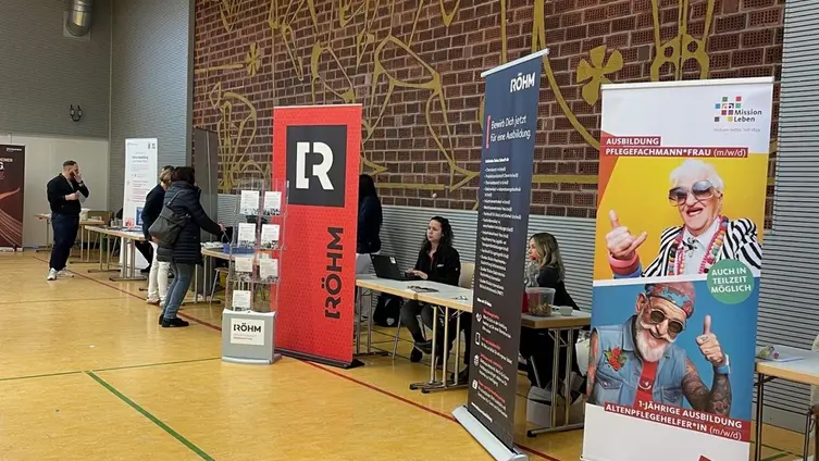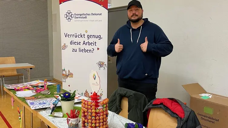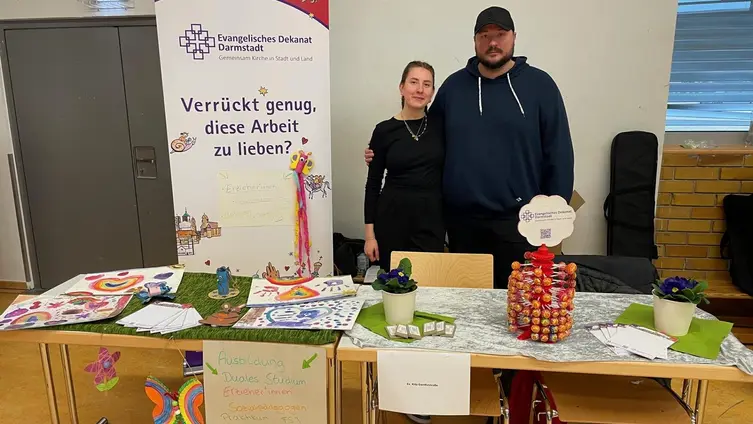 Anna Schülke und Marcel Vetter haben das Evangelische Dekanat und die Kita Goethestraße würdig auf der Ausbildungsmesse in Pfungstadt vertreten. Auf der sehr gut besuchten Messe informierten die beiden Mitarbeitenden über die Ausbildungsmöglichkeiten in den Kitas des Dekanats. Am Stand der beiden gab es Lollies, die sehr begehrt waren. Am Ende machten Besucher:innen sogar Liegestütze, um an die begehrte Süßigkeit zu kommen. Das sorgte für gute Stimmung in der Halle. :-)