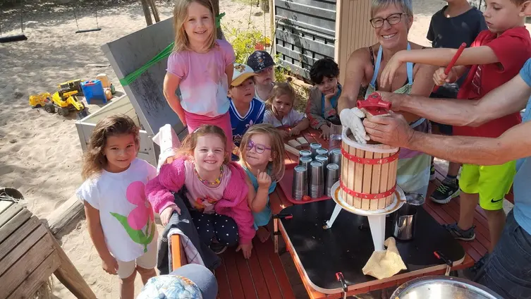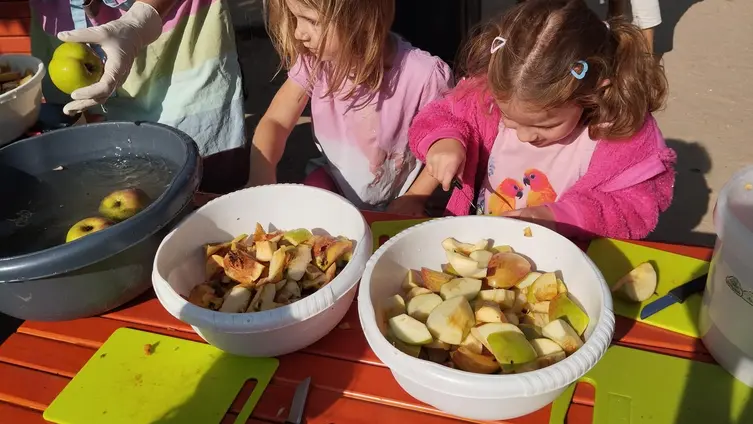 Das bedeutet viel Genuss, Spaß und Arbeit für uns. An vielen Tagen sammeln die Kinder Äpfel, schälen und schneiden sie. Dann werden Apfelringe getrocknet, Apfelmus gekocht, Apfelsaft gekeltert, viele Kuchen gebacken und Marmelade hergestellt.