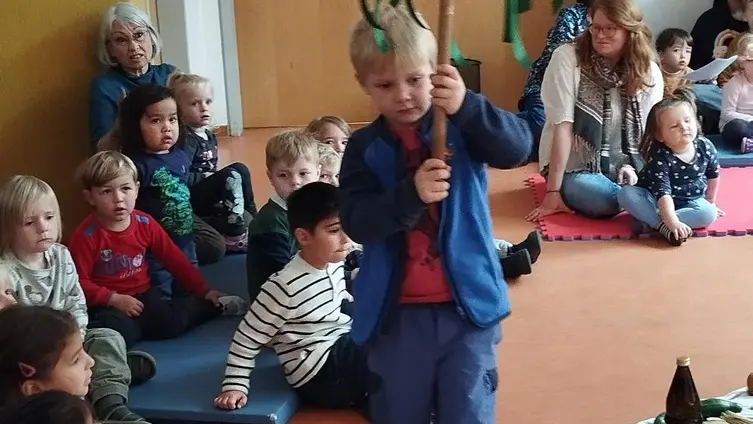 Gemeinsam mit ihrer Erzieherin haben die Kinder mit Figuren die Geschichte nachgestellt und erzählt.