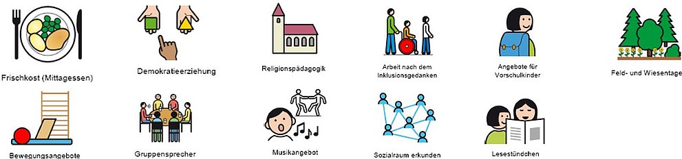 Metakom-Symbole unterstützen für alle die eigene Orientierung und Selbständigkeit in unserer Einrichtung. Ebenso bieten weitere Elemente aus der unterstützenden Kommunikation, wie Sprachbuttons und „sprechende Stifte“ die Teilhabe für alle in der Kita-Gemeinschaft.